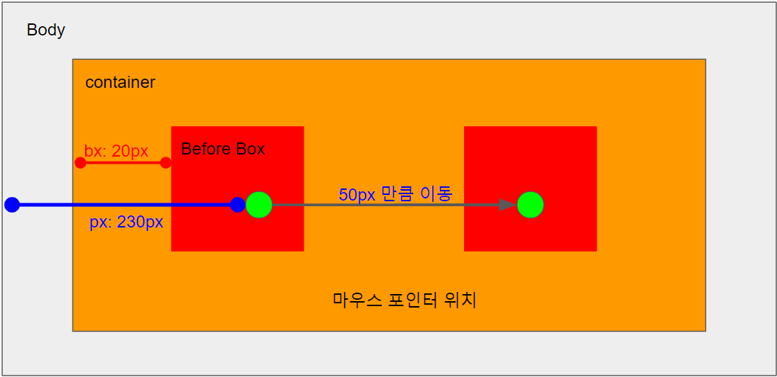 그리고 잡았으니 mousemove를 이용해서 움직이면 된다. 움직임의 원리는 마우스 포인터가 움직인 거리(50px)에 bx(20px)를 더한 값을 box.style.left 속성에 넣어주면 된다. 만약, bx를 더해주지 않을 경우, 박스는 컨테이너를 기준으로 50px 떨어진 위치로 이동된 후, 부자연스럽게 움직이는 박스를 볼 수 있을 것이다.